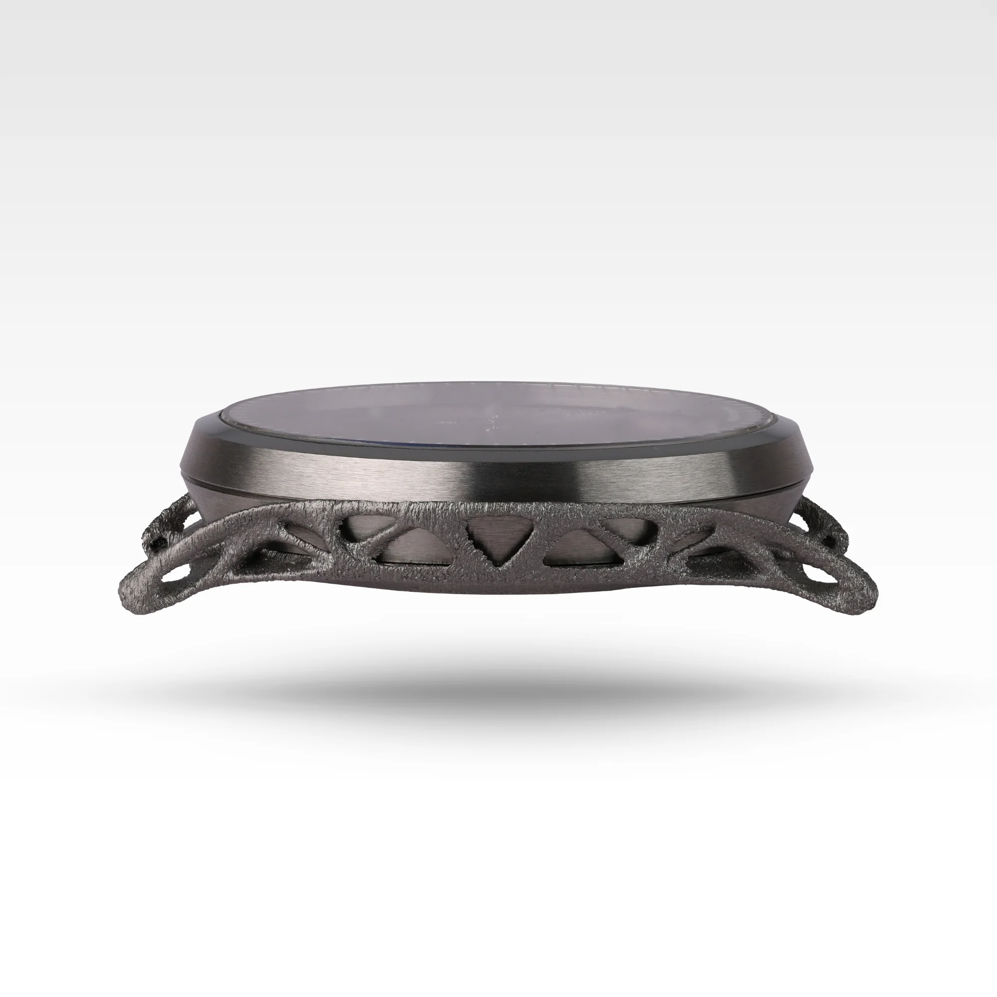 W modelu Gen1.0 zarówno środkowa część koperty (mid-case), jak i tarcza, zostały wykonane w tym samym procesie druku 3D z tytanu (produkcja addytywna). Co ważne, tarcza jest integralną częścią tej drukowanej konstrukcji. W praktyce oznacza to, że nie jest osobnym elementem przykręcanym czy montowanym później — powstaje razem z kopertą, jako jeden komponent.
