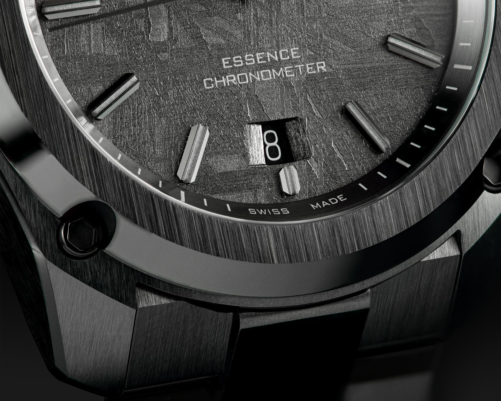 Pozostałe elementy tarczy to klasyka linii Essence. Indeksy i wskazówki w kolorze gunmetal wydają się niemal lewitować nad tarczą, co dodatkowo wzmacnia efekt głębi. Ich powierzchnie zostały szczotkowane, a fazowania – polerowane, co pozwala im efektownie łapać światło. Całość dopełnia BGW9 Super-LumiNova®, która zapewnia doskonałą czytelność także w ciemności.